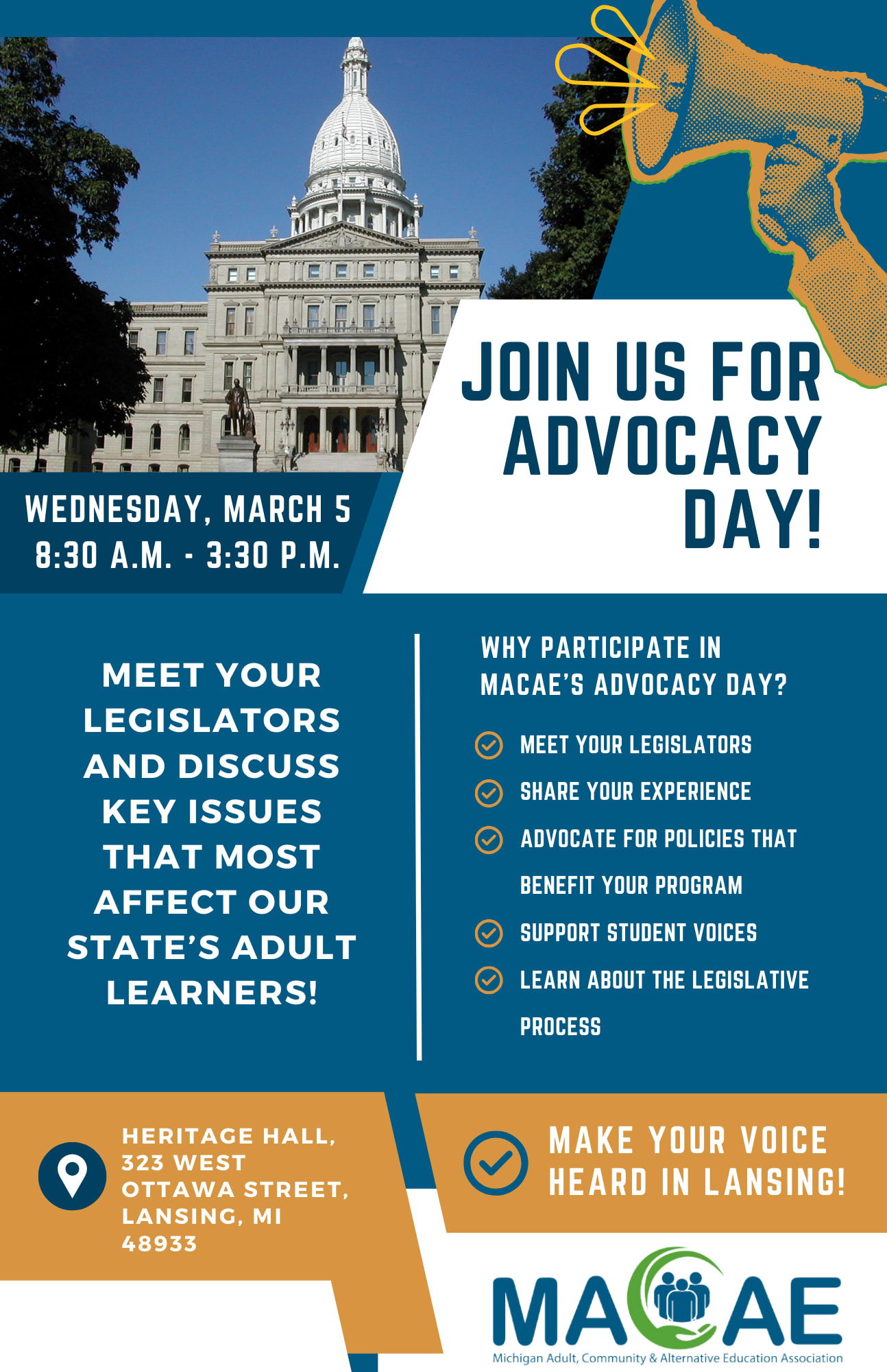 MACAE’s annual Advocacy Day will be taking place on Wednesday, March 5 at Heritage Hall (located at the North entrance of the Capitol Building), 323 West Ottawa Street, Lansing. This is a wonderful opportunity for MACAE members to connect with their legislators about important issues that impact their communities’ adult learners. This year, we are focusing our efforts on advocating for continued adult education funding as well as investments into the Adult Literacy Opportunity Fund.